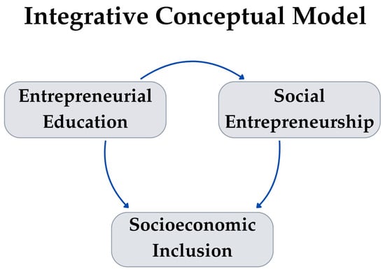 2.6. Conceptual Model: Entrepreneurial Education, Social Entrepreneurship, and Socioeconomic Inclusion