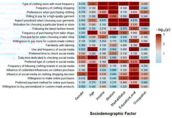 Inferential results for current (Classic) customers. The color gradient, derived from the transformation, reflects the strength of statistical evidence: darker hues (red/brown) indicate robust and statistically significant associations (), identifying sociodemographic factors that act as key drivers of consumer preferences. Conversely, lighter tones (blue) represent non-significant relationships, suggesting that these demographic dimensions do not materially influence the assessed consumer responses.