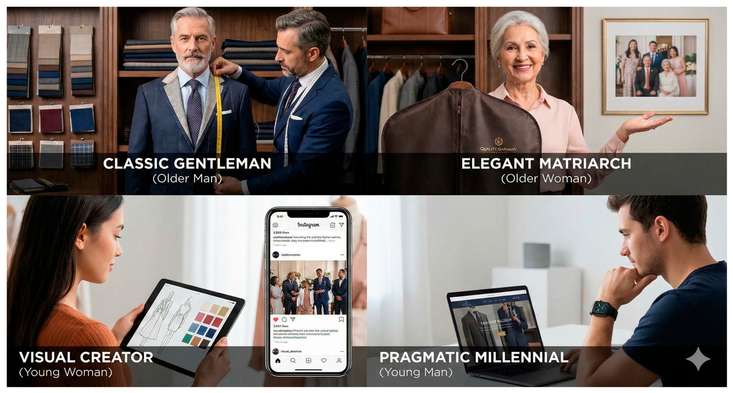 | 1. Older Men (55–80 years) “Classic Gentleman” | Economically stable, mature, and highly loyal customers with a strong emotional connection to the tailor shop. They value tradition, reputation, and tangible craftsmanship and represent the historical core of the business. |