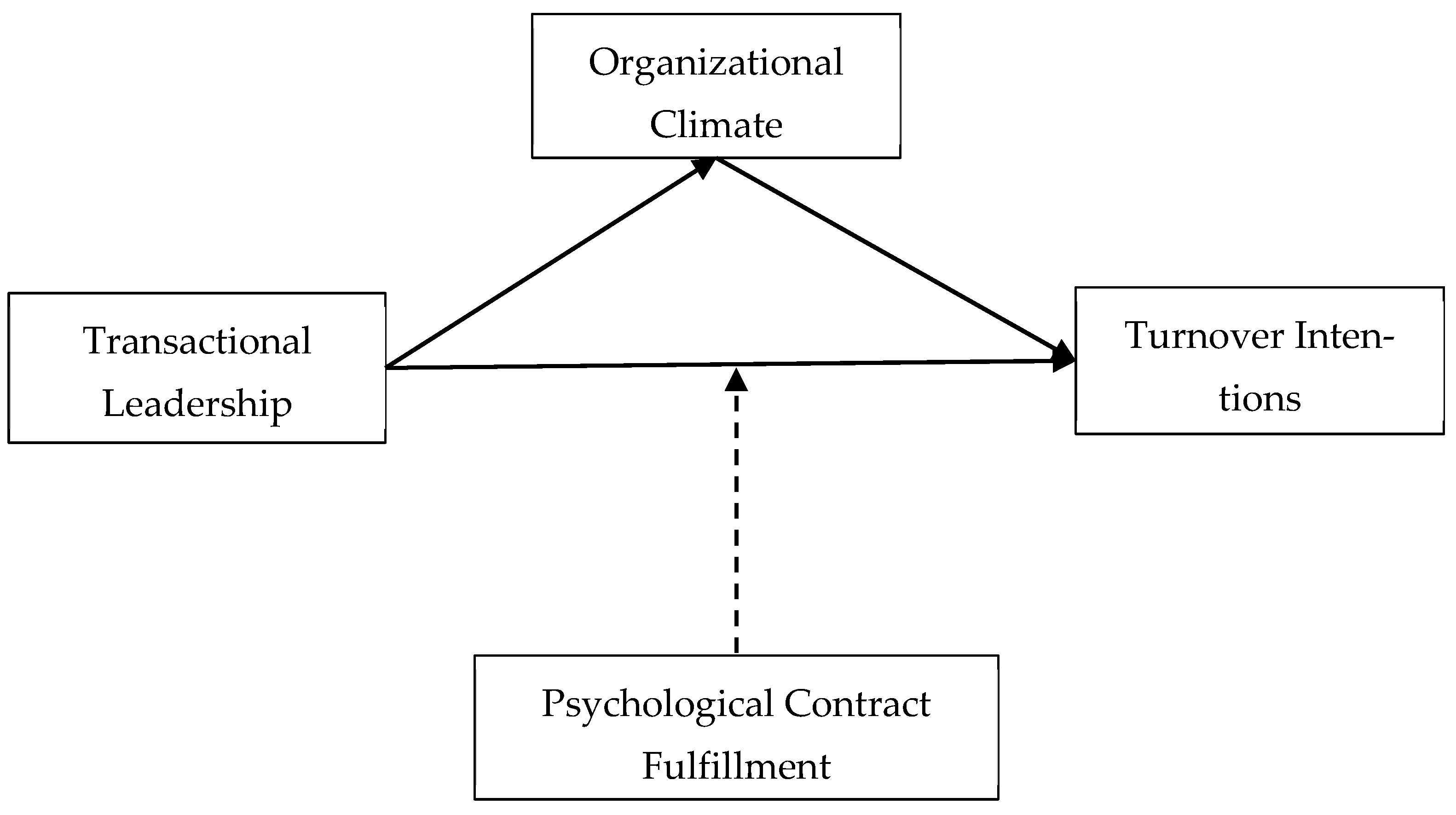 Figure 1 presents the research model. While transactional leadership is the independent variable, turnover intentions are considered the dependent variable. Organizational climate acts as the mediating variable, while psychological contract fulfillment will be assessed as the moderator.