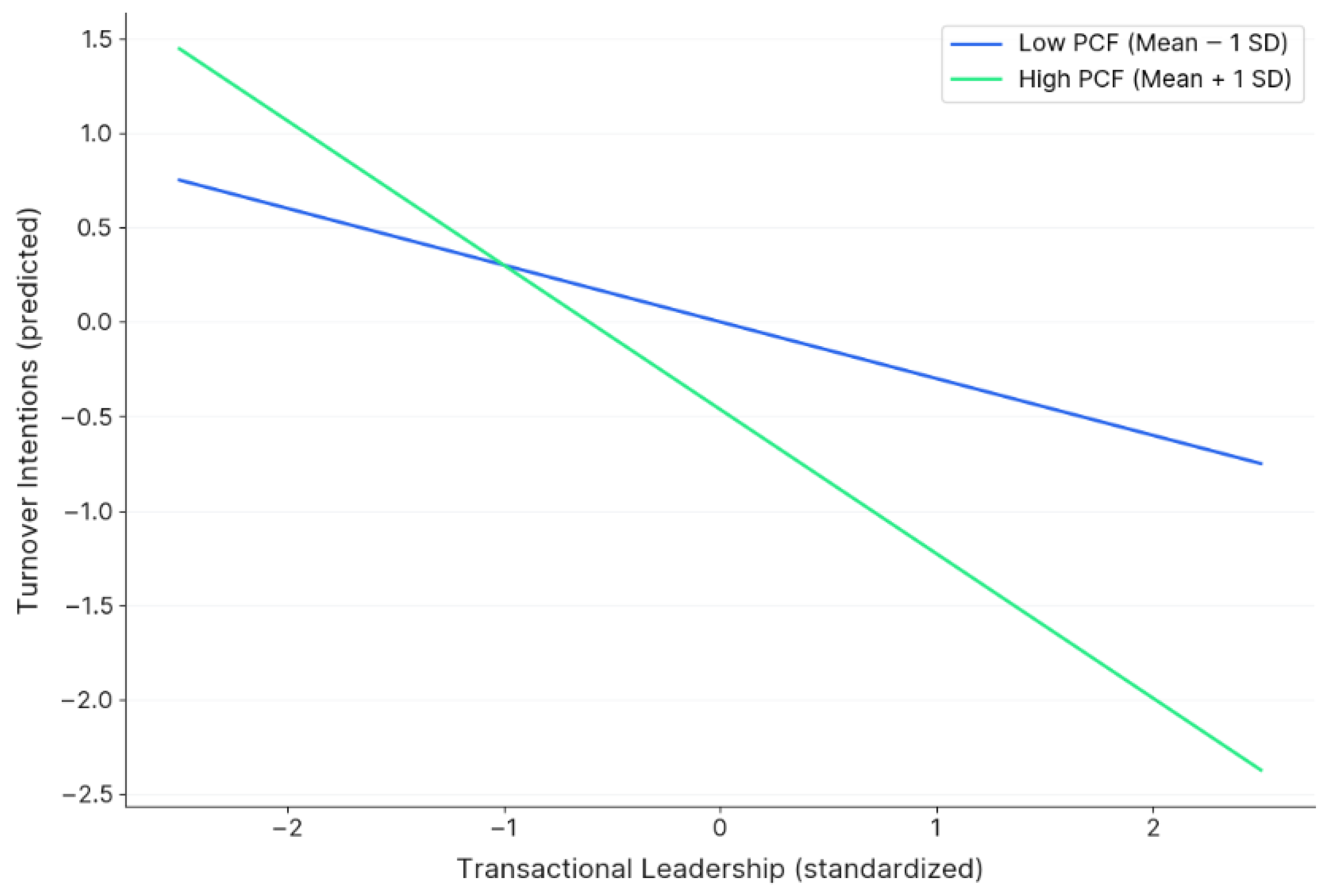 The findings in Table 4 and Figure 2 support the third hypothesis (β = −0.353, t = −2.932), stating that PCF is a key factor in determining how transactional leaders can improve outcomes (i.e., turnover intentions) in the hotel sector. PCF shows a significant moderating (diminishing) influence on the linkage between TL and turnover intentions, where higher levels of PCG can strengthen the link between leaders and reduce withdrawal among hotel staff. Particularly, in a labor-intensive sector, this improves the attitudes of staff towards the firm (Baquero et al., 2025; Mehta et al., 2024). The interaction plot in Figure 2 shows that when TL is low, higher PCF can act as a shield for the firm, covering its shortcomings in the leadership aspect. Higher PCF levels signal a firm-level investment in improving and honoring exchanges with the staff, which improves the sense of obligation towards the firm as a manifestation of reciprocity, leading to loyalty and continued employment (Al-Romeedy et al., 2023). This is because with lower levels of PCF, employees may perceive TL as merely instrumental, weakening its effectiveness in reducing turnover intentions. Similar reports in the extant literature support this notion (e.g., Kang et al., 2018) even when other aspects of the job can appear desirable (Nadiri & Tanova, 2016). This shows that TL alone is not as effective as when its capacities are boosted through meeting broader obligations. Integrations of PCF under the current theoretical framework show the protective role of PCF for TL, translating into tangible employee outcomes in the hotel sector. However, this may be different in locations where the rigidity of cultural and societal exchanges can be different. Therefore, when psychological contracts are fulfilled, it can be expected that with even more rigid leadership, this can be accepted. While the current sample of five-star Middle Eastern hotels shows a strong contract-fulfillment interaction with transactional leadership, it should be considered that cultural expectations can differ, and employee representation, voice, and institutional structures can change the way these are interpreted by employees.