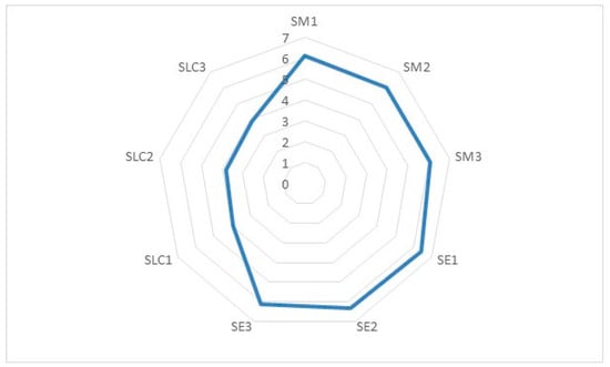 Figure 2 shows the relative importance of the variables relating to the sustainable open innovation paradigm construct. Each construct is made up of 3 variables so that SM1, SM2, and SM3 are part of the sustainable material (SM) construct, SE1, SE2, and SE3 belong to the sustainable energy (SE) construct, while SLC1, SLC2, and SLC3 are part of the sustainable local community (SLC) construct. The findings indicate that the first two constructs (mean = 6.073 and 6.301) have a much greater weight than the third construct (mean = 3.897).