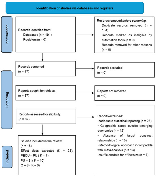 Retrieved records were imported into EndNote 21 for duplicate detection and removal. Study selection proceeded through two sequential screening stages conducted by independent reviewer pairs. The systematic literature search yielded 191 records. Following automated and manual duplicate removal, 87 unique records underwent full-text assessment. Of these, 72 were excluded: inadequate statistical reporting (n = 25), geographic scope outside emerging economies (n = 12), absence of target construct relationships (n = 15), methodological incompatibility (n = 13), and publication outside the 2021–2024 search window (n = 7). The final synthesis comprised 15 studies that contributed 23 effect sizes.