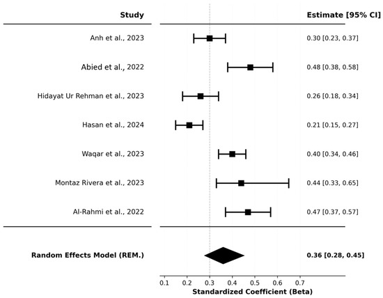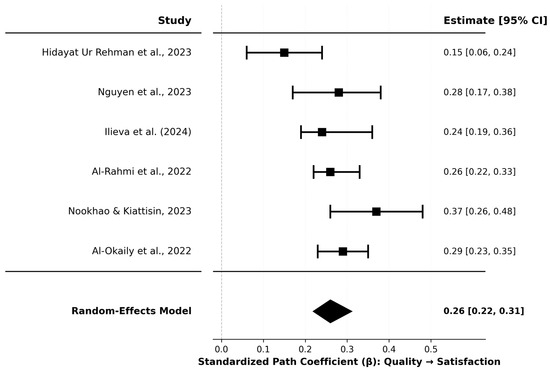 Forest Plot of Standardized Path Coefficients (Quality→Satisfaction). The forest plot showing individual study estimates and the overall pooled effect. Individual study effect sizes ranged from β = 0.15 (Hidayat Ur Rehman et al., 2023) to β = 0.37 (Nookhao & Kiattisin, 2023). All six studies reported positive coefficients, with no studies showing negative associations. The confidence intervals for individual studies varied in width, reflecting differences in precision across studies. Hidayat Ur Rehman et al. (2023) had the widest confidence interval (CI: 0.060 to 0.240), while Al-Rahmi et al. (2022) had the narrowest (CI: 0.222 to 0.304). (Hidayat Ur Rehman et al., 2023; Nguyen et al., 2023; Ilieva et al., 2024; Al-Rahmi et al., 2022; Nookhao & Kiattisin, 2023; Al-Okaily et al., 2025).