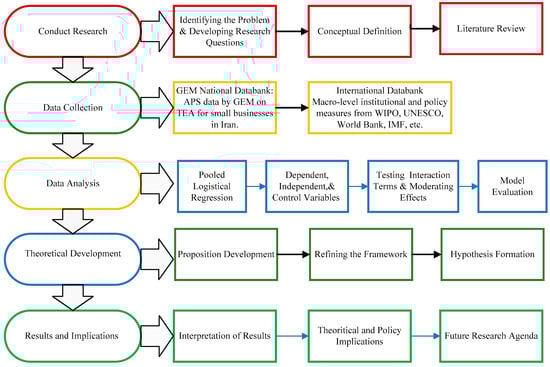 The research process, illustrated in Figure 2, begins with problem identification through a literature review, leading to research questions and concept definition. Theoretical development involved refining the framework, forming propositions, and developing hypotheses. Data collection included firm-level and macro-level institutional measures, analyzed using pooled logistic regression to test key variables, interaction terms, and moderating effects. Final model evaluation informed theoretical and policy implications, guiding the development of a future research agenda based on identified gaps.