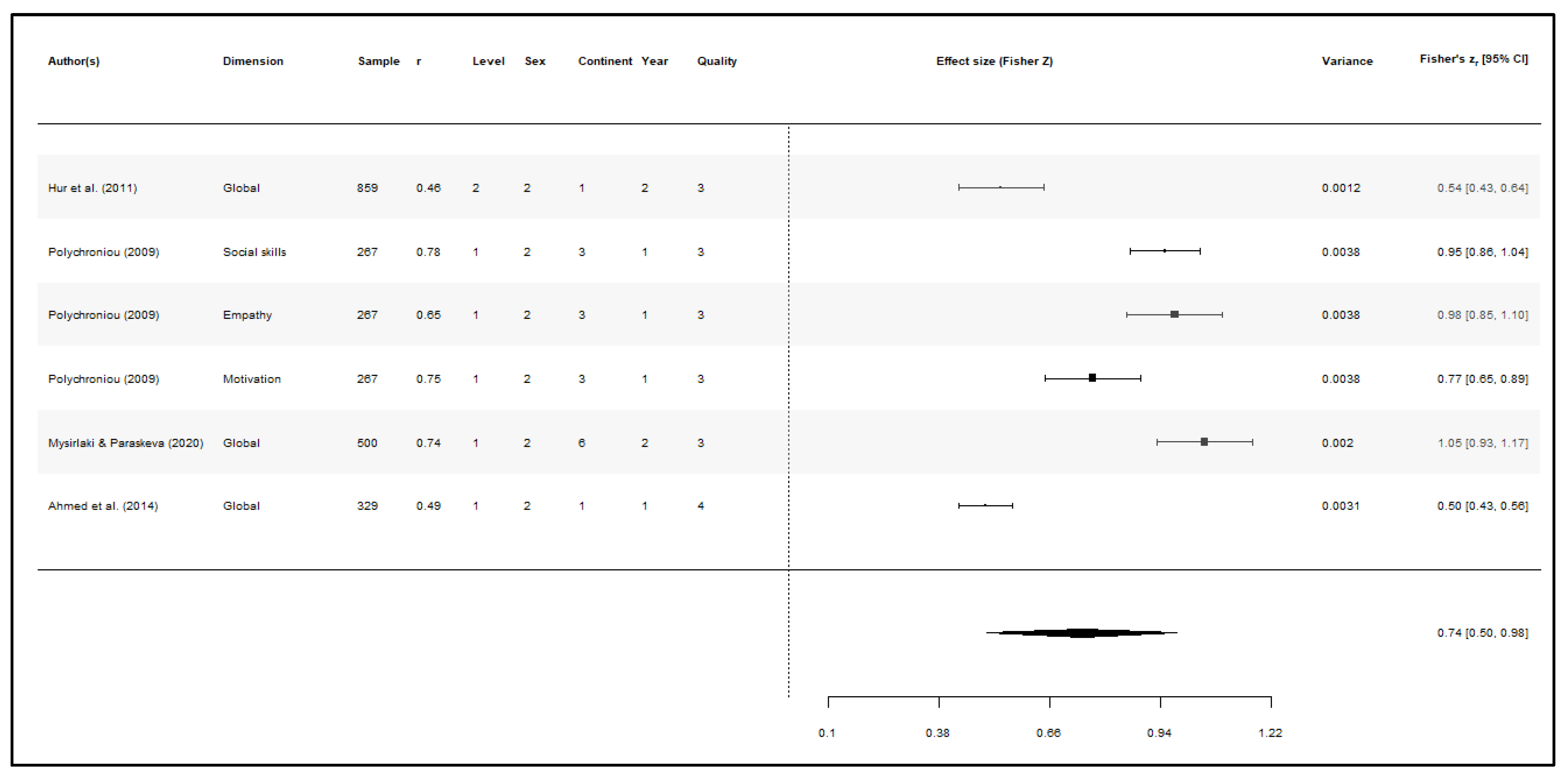 | 1 | Methodological quality | 0.415 | 0.05 | 0.014 | * | Moderate |