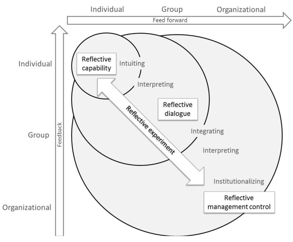 Learning theories and their interpretations in management research recognize the role of reflection as a central element in the learning process. There also exists a broad consensus that organizational learning (OL) happens at three intertwined levels of the individual, the group and the organization. This tri-level analysis has been most influentially presented by Crossan, Lane and White (1999), as a premise for their 4I framework of OL. Though the 4I framework builds strongly on existing literature on OL, it does not address the role of reflection as a factor operating between the inputs and outcomes in 4I sub-processes. Though a large body of research exists regarding the notion of reflection and its importance in terms of OL, this has not been discussed in the specific context of the 4I framework. This article contributes to the development of the 4I model by discussing how reflective practice—on three levels and within 4I sub-processes—fuels the OL process. The argumentation is based on an extensive literature review in three dimensions of learning, illustrated with an empirical inquiry into three business organizations and their reflective practice. In addition, the aim is to increase the understanding of reflection as not only an individual or group process, but as an organized practice, enabled by the tools of management control.