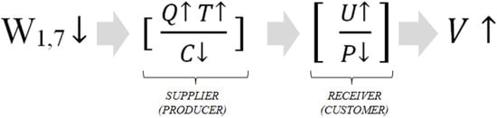 The major contribution of the “Lean” manufacturing lies in being able to integrate into a single, consistent view based on the value, the more important variables up to that point identified and recognized in manufacturing, and have identified in Muda the operational issues on which to take measures to improve the efficiency and, therefore, the overall performance. The importance of removing Muda is based on the direct connection of such variables; by intervening on a Muda, a synergistic and positive effect on the competitiveness of the entire system is enhanced. It is clear that, improving internal efficiency by operating on transportation, handling and inventory implies improving Q, T, or reducing Cs, and, thus, be able to manage prices, or provide a higher level of performance to the customer and then to increase value. The following scheme (Figure 2) summarizes how a reduction of the seven Muda listed above may reflect in a positive effect on the major performance indicators of the Lean approaches (C, T, Q) and how this would enable the supplier/producer to increase the satisfaction (perceived usefulness) of the receiver/customer or lower selling prices (margins), that is, increase the value produced and transferred.