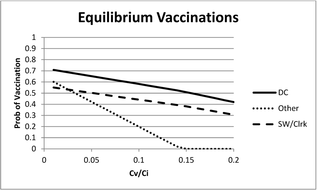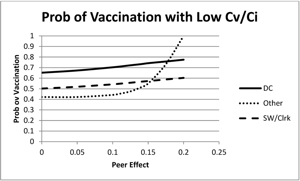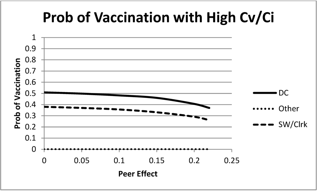 An interesting intermediate vaccination cost case is shown in Figure 5, . At this level of λ and no peer effects, two of the groups have a relatively high probability of vaccination, and the “remaining” group has a low probability. As the peer effects increase, the “remaining” group decreases its probability of vaccination and the direct care and social worker/clerk group increase theirs. To better understand this result, recall that the majority of contacts of each of the direct care and social worker/clerk groups are with the direct care group. Thus, when the direct care group begins with a high probability of vaccination, this pulls these two groups upward. On the other hand, the “remaining” group has its largest share of contacts with itself (which has an initial low probability of vaccination). Thus, the peer effects lead to a decrease in the “remaining” group probability of vaccination.
