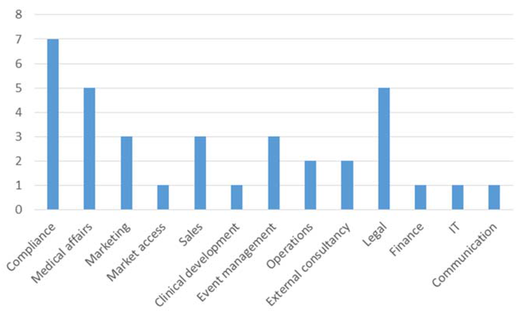 Interestingly, there was no significant difference between vfa members and non-members in our survey. This may be explained by several reasons including the fact that some companies agreed to fulfil the requirements even though they are not members of the vfa. On average, participants tended to be neutral when asked about differences between clinicians and practitioners with regards to the transparency code. Participants who agreed that the transparency code will change their cooperation with HCP/HCO also agreed that internal process changes within the company are vital (mean = 2.30). Asked which departments are currently involved in implementing the code, it comes as no surprise that the compliance department was mentioned most frequently, see Figure 4.