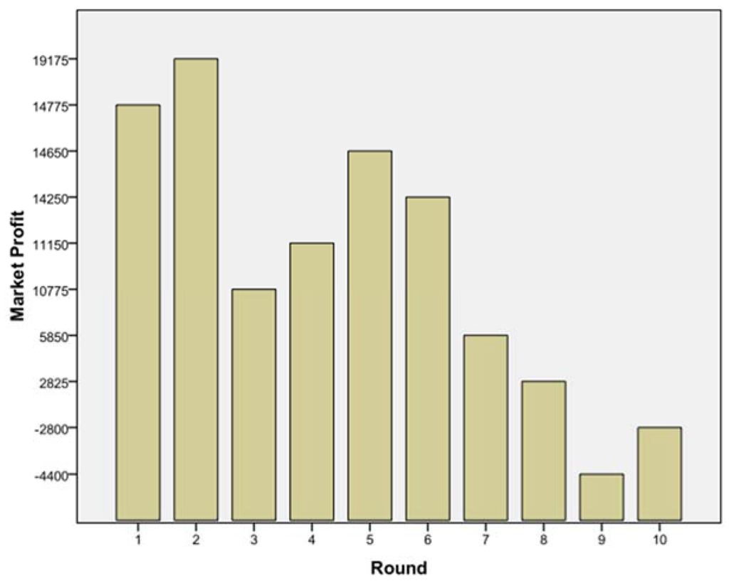 The authors facilitated five games each covering 10 rounds and hypothesised that players do not behave rationally when confronted with choices concerning their own (company) well-being versus the overall (market) well-being [23]. The following hypotheses were postulated: