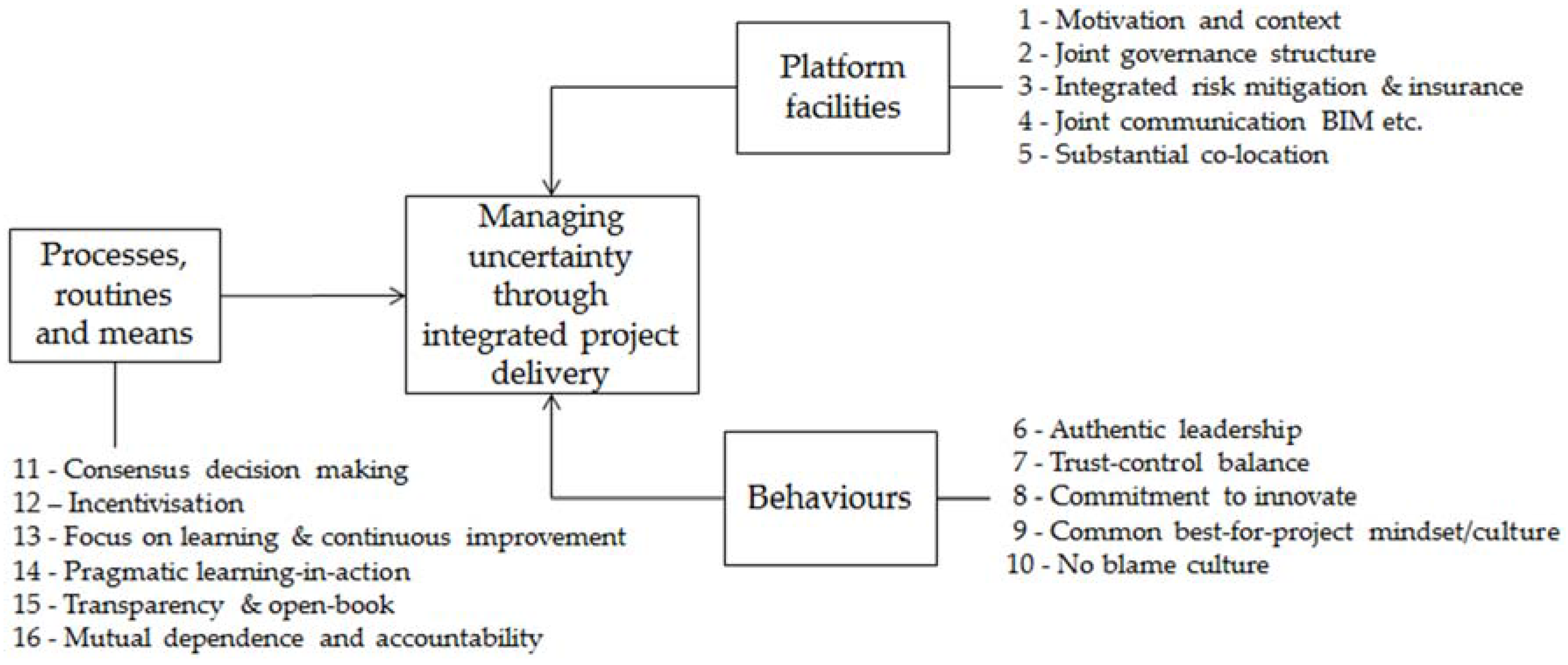 Hope is transformed into intended action through a process of ‘ensuring’ that the intended result is realised. This in more general terms can be seen as a governance and leadership issue. Müller [74] (p. 4) explains the term governance as ‘…the value system, responsibilities, processes and policies that allow projects to achieve organizational objectives and foster implementation that is in the best interest of all the stakeholders, internal and external, and the corporation itself’. This view of governance fits with the RBP [8] framework foundational element of a joint governance system (described earlier) as well as element 15 in particular in which the level of transparency and open-book arrangements fit the designed collaboration intensity specified through the contractual form and its application for the level of pain-gain sharing agreed upon. The level of enacted innovation that can be expected to match the hoped for innovation level is governed by a series of protocols, such as element 11, consensus decision making, that support element 10 no-blame behaviours, discussed earlier. These shape a set of support systems with the emphasis on systems. The way that the workplace setting and its ambience is affected by participant behaviour and interaction as well as the way that the project organisation presents itself, both to itself and to outsiders [75]. For highly integrated project delivery forms, such as alliances and the T5 type arrangements [58], the project team is badged by a common logo, entity and set of project specific values. This common sense of purpose through design and the ‘one-team’ ethos provides an ensuring mechanism that crystallises intent into action.