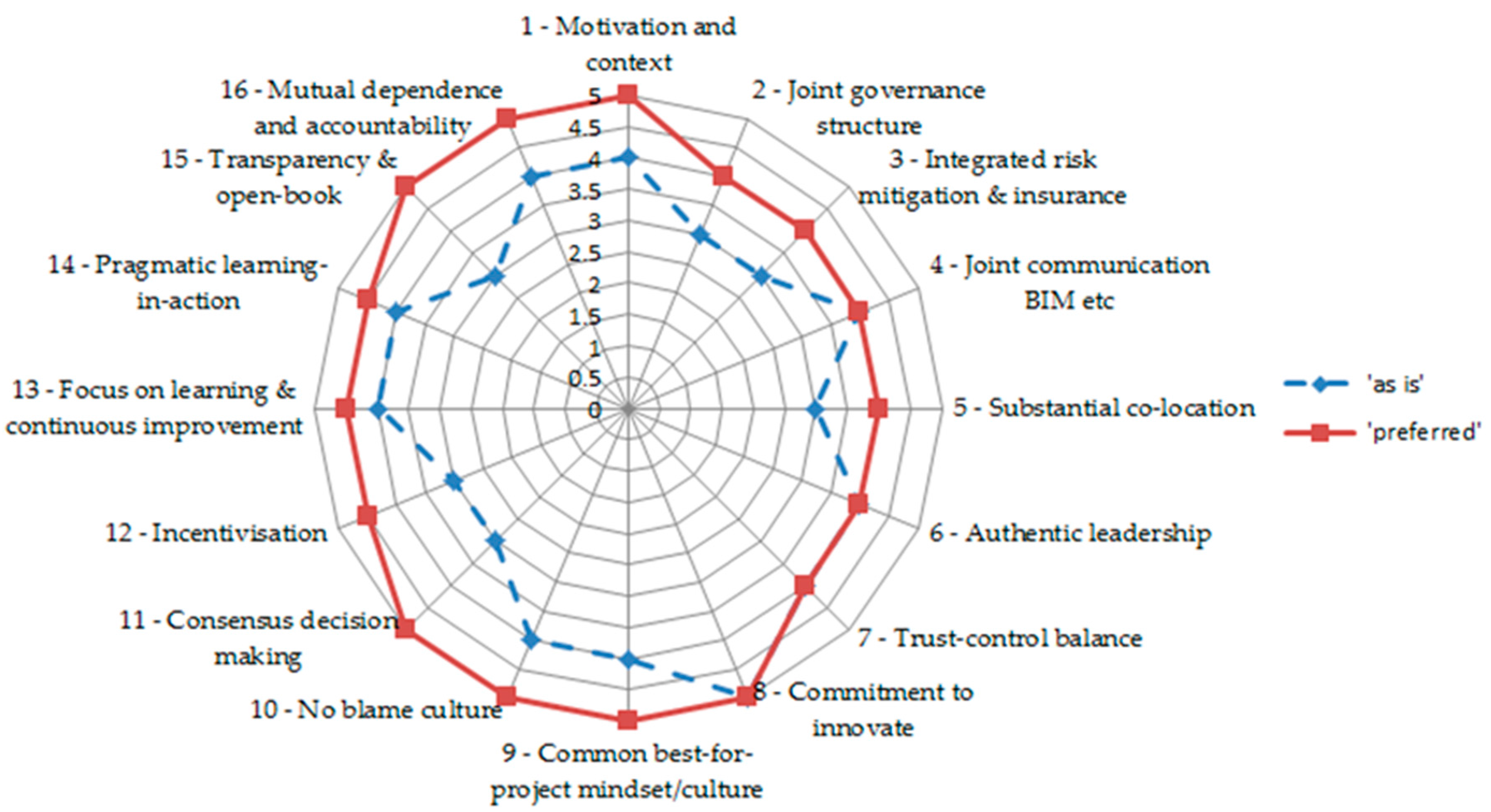 Figure 2 presents a hypothetical ‘as is’ project situation versus a ‘preferred’ project map in which the authors have rated each element in the framework based on their understanding of the literature on RBP forms in the construction sector and similar PM sectors. This illustrates how this tool may be used to benchmark an ‘as is’ project situation to compare with a ‘preferred’ situation and then to use this to develop strategies to move from the ‘as is’ to ‘preferred’ one. This may involve designing, adapting or shaping an existing project delivery choice, for example moving from a more traditional partnering type delivery arrangement to an alliancing or integrated project delivery situation. There are many variations in partnering arrangement projects from ‘hard money’, in which there may be a form of partnering imposed on somewhat unwilling participants through to whole hearted alliances where there is a strong and committed enthusiasm for genuine collaboration. It can be assumed that in both alliances and partnering, for example, the rated element values may vary. This is demonstrated by the experience and expert opinion documented in numerous partnering studies [76,77,78,79] that report on quite a varied level of commitment to best-for-project outcomes and studies of alliancing [51,70,80,81,82,83]. While the cited studies present some general picture that can be interpreted in the ratings presented in Figure 2 we acknowledge that these may vary by at least one point in the scales. Given that caveat, Figure 2 provides a map that at least provides a general scope indicator. Some inferences can be made that are of value.