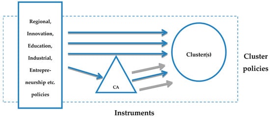 Since the development of the argument that clusters have a positive influence on territorial development, policy makers have actively applied different instruments for their support; this is called cluster policy. Kiese [] and Hospers [] see cluster policy as all state measures towards the support and development of clusters, whereas Benner [] developed a broader view and claims that cluster policies contain not only governmental contributions but also activities in collaboration with private actors that are oriented to stimulate the cluster’s efficiency. Enright [] demonstrated five levels of political influence on clusters, from non-existent cluster policy via catalytic and supportive to directive and interventionist. This policy has often been recognized as an effective approach for cluster and further regional development. Moreover, clusters and cluster policy continue to stay at the heart of the latest European agenda on regional smart specialization strategies [,,,].