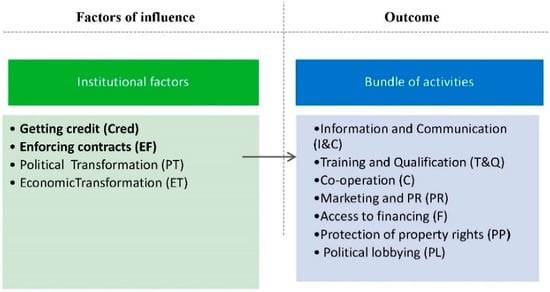 As proxies defined to measure institutional constraints, reference to internationally available data from the World Bank’s Doing Business Reports and the Bertelsmann Transformation Index is made. Lower Rankings in the World Banks Doing Business Report on ’getting credit‘, and ’enforcing contracts‘ points to the existence of voids in the institutional framework [,]. It is assumed that this will have a direct influence on the design of cluster activity bundles. Furthermore, the indicators for institutional factors from the Bertelsmann Foundation’s Transformation index are expended, aiming to get a clearer picture of the formal institutional environment. The rankings on political and economic transformation also indicate the completeness of the institutional environment. Germany and Austria are not listed in the Transformation Index as they are considered to be readily transformed.