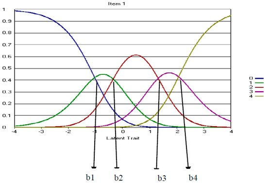 The probability of selecting each response option is obtained for individuals on a continuum of ability levels and illustrated on an IRC. In polytomous IRT, the b parameter is defined as the point on the ability continuum of an IRC at which two consecutive response option curves intersect [19] (See b1–b4 in Figure 1). It is important to note that the step difficulty parameters should follow an order such that moving from a high response option to its next highest response option ought to be more difficult for respondents than moving from a lower response option to its next highest response option. For example, it is expected that moving from strongly agree (coded as 4) to agree (coded as 3) in CWEQ II would be more difficult (i.e., require higher level of SE) than moving from agree to neutral (coded as 2). This notion is also shown in Figure 1 where b1–b4 follow a consecutive order from lowest to highest. Also, if all of the category response curves of an item were located below or close to 0 on the continum, this would indicate that the item was fairly easy. In the case of CWEQ II, this means even staff nurses with low SE levels would be likely to select the highest response option.
