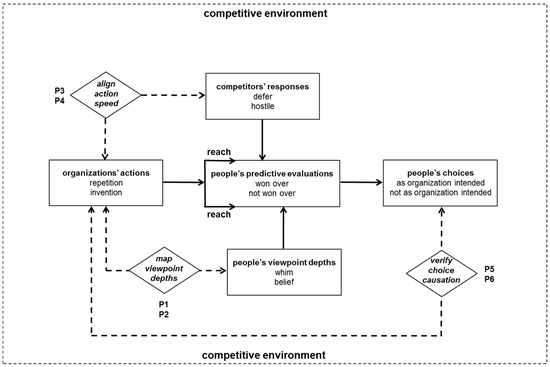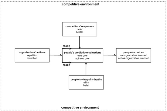 The conceptual framework for a better understanding of CSA competition is shown in Figure 1. This comprises the constructs summarized in Table 1 and described in Section 2 above. In particular, the conceptual framework comprises organizations’ actions (from repetition to invention); actions’ reach duration (from zero to indefinite); people’s viewpoint depths (from whims to beliefs); competitors’ responses to actions (from defer to hostile); people’s predictive evaluations (from won over to not won over); people’s choices (from as intended to not intended); and competitive environment (duopolies, oligopolies, and winner-take-all).