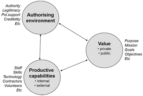 What is telling about the framework is that it resonates both with practicing public sector managers and with scholars (although it is not without its critics—see (Dahl and Soss 2014)). Mark Moore (Moore 1995) fashioned it on the basis not only of his academic research but also of his teaching on executive education programs for public managers at Harvard’s Kennedy School. Since then, the model has been taken up in numerous institutions and programs numbering in the tens of thousands or more. Moore’s conception saw public managers as explorers who were constantly looking for new ways to create public value. He encapsulated the framework in his “strategic triangle”, consisting of the value to be produced, the authorizing environment and the productive capabilities (see Figure 2).