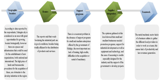 So, the most important aspects identified in the study highlighted that, since they did not have government support, the greatest threat for these small enterprises were competitors, who could offer products with higher quality and more flexible payment terms. A total lack of training was also mentioned, specially the one that allows suppliers to function as formal businesses. Furthermore, the lack of “corporate culture” was also pointed out, understood as the resources and capacities available for the company, which generate intangible assets and/or inimitable strategies considered as explanatory variables of the business competitive success (Barney 1991). According to Figure 7, Sahagun City is located strategically with roads in good condition; however, it does not have the necessary infrastructure and there are many unexploited lands due to difficult procedures to acquire them and exorbitant costs imposed by the authorities for property purchase. Similarly, the lack of government programs that promote training and the lack of economic credits were pointed out.