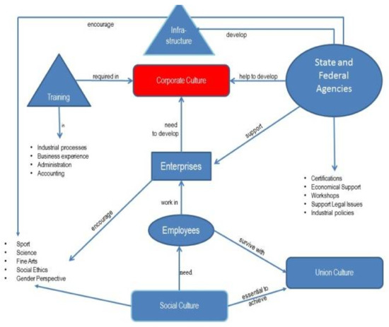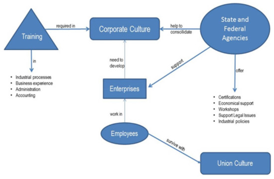 With the information obtained, the first version of a model was developed as shown in Figure 8. This model shows mainly the necessity of government support to create corporate culture in small and medium enterprises, because they do not know fundamentally, conceptual elements to operate as companies and to be competitive in the long-term. Generally, the need for training in strategic planning, accounting, administration, industrial processes, etc., can be observed. The government should also provide financial support, since the credits offered are currently very high. Besides, as pointed out by Gozgor (2016), “the effect of international trade on employment transformation can only exist in the shifting from manufacturing to services”. So, certifications, workshops, and support in legal matters among others, was also identified as a requirement.