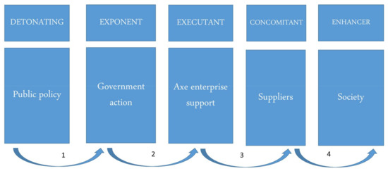 There are four transition stages in the sequential flow. In the first stage, the implementation of the public policy determines the government action, where authorities lead the procedure, involve all the possible actors and expose the intention. The second transition stage consists of selecting a core enterprise where the policy might be applied, for integration this enterprise is the executant. During the third transition stage, the suppliers converge in a concomitant effort to align their products and services to the requirements and inner demands of the axis enterprise. Finally, in the fourth stage, suppliers become the link with society, making use of its tangible and intangible assets as incomes for their activities, and returns benefits to the society. This sequential flow could be applied in the Mexican context for suppliers’ integration.