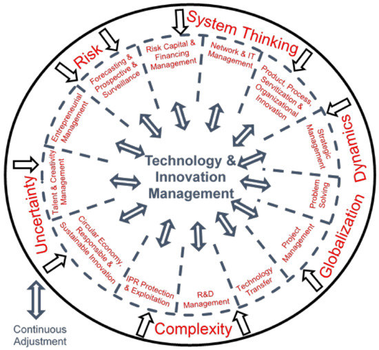 Otherwise, how can big, medium, and small innovative firms cross the valley of death, in a specific local field of knowledge in an uncertainty and complexity system management? In the linear model, the answers to this question—at the end—arise from the rationale related to the rate of firm investments. However, in the interactive and cooperative rationale, there are many possible answers to this question. They involve taking care of not only risk capital or financial supports but also other internal and external firm’s and personnel competencies to overcome a diversity of bottlenecks and issues that directly affect the ability of such firms to innovate. Even governmental and societal regulations and culture influence the possibilities and criteria for handling complex social and environmental issues. Going beyond the identification of all competencies and instruments for solving the European Paradox and the innovation gap embedded in the management of innovation and technology, we can synthesized a model of relationships in a graphical form. In Figure 2, the external circle shows the basic conditions or contexts necessary to manage or apply successful management in technology and innovation. Some of them are external to the organization (e.g., globalization), some internal (e.g., system thinking), and others are both internal and external (e.g., complexity, uncertainty, and risk). The inner circle includes the specific tools and competencies for technology and innovation management. Despite the circular and interrelated character of the main competencies and instruments within this model (Figure 1), it can be observed that the instrumental knowledge competencies and tools for technology and innovation management can be considered as a starting point for the strategic management of technology and innovation. The ending point is an operative competence for problem solving, following the circle in the counter-clock direction. In the middle of both, other competencies and tools include product development, research and development (R&D) management, technology transfer, and more. In other words, this model of technology and innovation management requires not only that the large picture (of the strategy) is considered but also follow-up on smaller details (problem solving at plant and working space level).