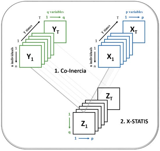 Simier et al. (1999) and Thioulouse et al. (2004) presented what they call the STATICO method, which, in reality, is a combined study of a co-inertia analysis and a STATIS. In this research, we perform an X-STATICO analysis (co-inertia and X-STATIS, which are described below). The X-STATICO method is an efficient tool for the simultaneous analysis of a succession of pairs of tables. The flexibility of this technique comes partly from the co-inertia analysis, which maximises the squared covariance between the values of the individuals according to two different sets of variables. Figure 1 shows the procedure scheme on which the X-STATICO analysis is based.