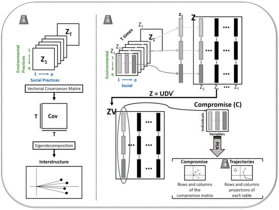- The compromise analysis: the second stage consists in the compromise analysis, where, through the vectorisation of the matrices, that is, a linear transformation that converts each matrix into a column vector, concatenating the constituent columns of each matrix one on top of the other; so, if we have matrices, we have a new matrix of columns and rows, with being the number of individuals (our environmental practices) and being the number of variables (social practices) that, as we said, should be the same for each matrix. We call this matrix . From a decomposition in singular values of the matrix , we get a new matrix known as the matrix, from which we extract the first column that contains the factorial loads of the first eigenvector—which carries most of the information—and provides us with the information that all the matrices have in common, and, unfolding this vector, we obtain the compromise matrix (C). This matrix synthesises the information of each one of the individuals in the variables for the times or occasions, ‘filtering the noise’ and representing the statistically significant information: the stable structure of the data. If we apply a principal component analysis to this matrix, we can trace and interpret its structure, where environmental practices (rows of the compromise matrix) and social practices (columns of the compromise matrix) are represented, which refer to the information during the times. With this information, we can interpret the relationships between the variables of two types (environmental and social) based on how all of the countries behave in them through the compromise analysis.