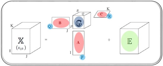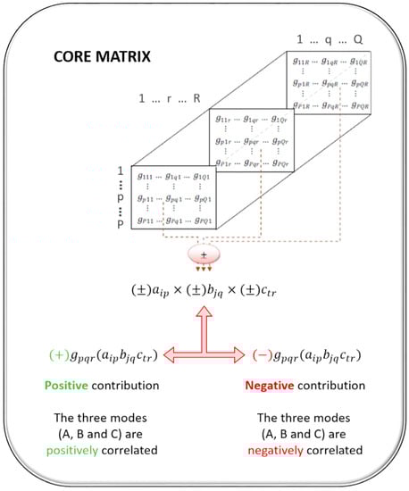 - represents the central matrix known as the core matrix of . dimensions, . This matrix represents the value by which the product of a single component is weighted, so that the value and sign of each element of this matrix provides information about the entity of the interaction between the components of the different modes. In addition, it contains the amount of variability explained by the combination of said components (P, Q, and R).