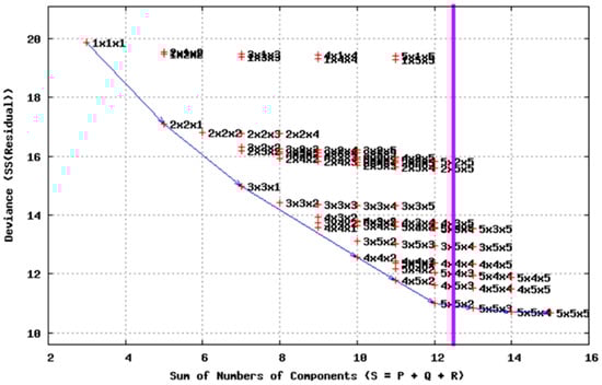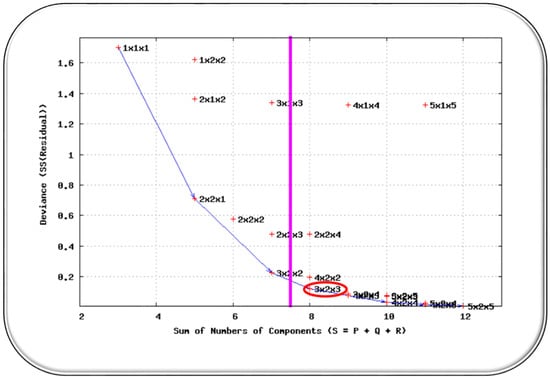 Once all the possible combinations have been made, the combination that presents a sufficiently high percentage of explained variance and the simplest of the most stable ones is chosen. The sum of the number of its components is calculated for each of the models, , and, for each value of , the one with the highest variance value explained is selected, or equivalently, a lower value of the residual sum of squares. In this way, we obtain a list in which each of the models has a value of . In increasing order of , the incremental quotient between the residual sum of squares and is calculated for each of the models, and we only remain with those models for which their value of the incremental quotient is similar to the next, that is, the more stable models. Finally, we would select for our analysis that model of the stable ones with a lower value of , that is, the simplest among the most stable. We show in Figure 4, by way of example, where the models positioned in the polygonal line (blue) are those with the smallest values in relation to the residual sum of squares (vertical axis) for each value of (sum of components, horizontal axis); and the vertical line (purple) separates the most stable models (right) from the least stable models (left). So, for this particular case, the selected model would be the 3 × 2 × 3 for being the simplest among the most stable.