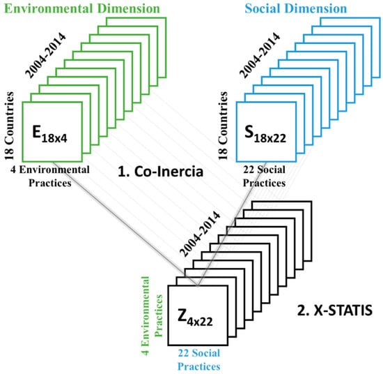 The next step is to perform an X-STATIS analysis (Jaffrenou 1978) on these tables, where the rows refer to the practices that evaluate the environmental commitment of the companies and the columns correspond to those that measure their concern for social welfare (Figure 2). The STATIS family methods (Structuration de Tableaux A Trois Indices de la Statistique) are data analysis techniques that have been developed to extract the relevant information stored in three-way data tables; that is, several two-way matrices indexed by time (Escoufier 1976; L’Hermier des Plantes 1976). The essential idea of the STATIS methods is to look for a common structure to all matrices, which is called structure consensus or compromise; for it, scalar products are made between matrices capturing the statistically significant information. The X-STATIS is a technique belonging to the STATIS family, with a peculiarity, since, although it is only applicable to the set of matrices constituted by the same individuals and the same variables in times or occasions, it has the advantage of not losing the original information, since it does not use operators. Instead, it works directly with the matrices, which also makes its procedure easier and allows more representations. This method follows a three-stage scheme: (i) the interstructure study, (ii) the compromise analysis, and (iii) the intrastructure study.