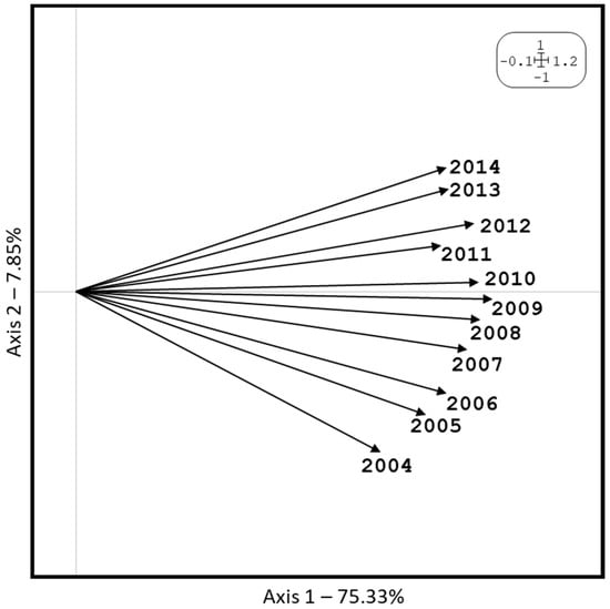 Acute angles between vectors can be observed, that is, strong similarities between years, produced in a gradual way, since the first year of the study, 2004, is located in the lower part of the figure, and as the years increase, they increase their position until they reach 2014, which occupies the highest position. Therefore, we intuit a constant growth in the commitment of company sustainability in this decade of study. Also, the ‘average year’, which was most similar to the stable configuration, is seen for the years 2009 and 2010, which were those closest to the abscissa axis. They were also the intermediate years of the study, since as we said, the relations are produced in a gradual way.