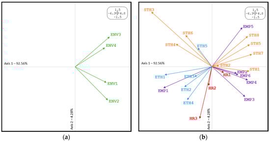 In relation to environmental practices, all of them are located in the right semi-plane (quadrants I and IV); with this information, we understand that the countries with the most sustainable companies would be positioned on the right side next to these variables, since it would be difficult to conceive that a country denominated as sustainable presented low values in environmental practices. In reference to social practices relevance, it is argued that those countries with strong demands for environmental practices give similar importance to practices aimed at the participation of both employees (EMP4) and stakeholders (STH5) in the decision making of the company; to the health and safety of these (EMP3), equal opportunities systems (EMP2), as well as training (EMP5) and job creation (EMP6); systems for the good management of stakeholders (STH7) to maintain good relations with the community (STH1), and information disclosure (STH8); all of them located in the right semi-plane (quadrants I and IV) and maintain a direct relationship with environmental variables. The rest of the variables have an inverse relationship with the environmental ones, such as equal opportunities policies (EMP1) or policies on stakeholders (STH6), and those related to human rights and ethics receive less importance.