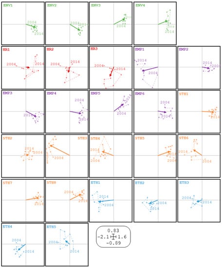 The third and last step of this analysis includes the intrastructure study, also known as trajectories, which allows us to interpret, by the projection of each one of the rows (environmental variables) and columns (social variables) of each of the starting tables (years) about the compromise subspace created, how these relationships vary over time. This representation (Figure 9) has been separated for each of the variables in order to obtain an individualised view; the vector represents the commitment position of each variable and the union of the points the trajectory from the first year of study (2004) to the last (2014). It can be observed that social practices that have a direct relationship with the environment, that is, those positioned in the right semi-plane (quadrants I and IV), show greater stability, with homogeneous locations occupying a similar position in the plane during this decade; this may be because these practices respond to the expectations of the stakeholders that are a very important part of the company and provide great reliability on the rights of their employees, creating an image of a responsible and concerned company on their part, internally as well as externally, workers, stakeholders, consumers, etc. Apparently, these practices have forged a place next to the environmental ones, acquiring an importance close to these, so that both consumers and any other interest group of the company no longer simply demand the protection of the environment, but also the development of systems oriented to labour rights and dealing with different stakeholders that arise from the employee relationships, transparent dialogue, and participation with stakeholders.
