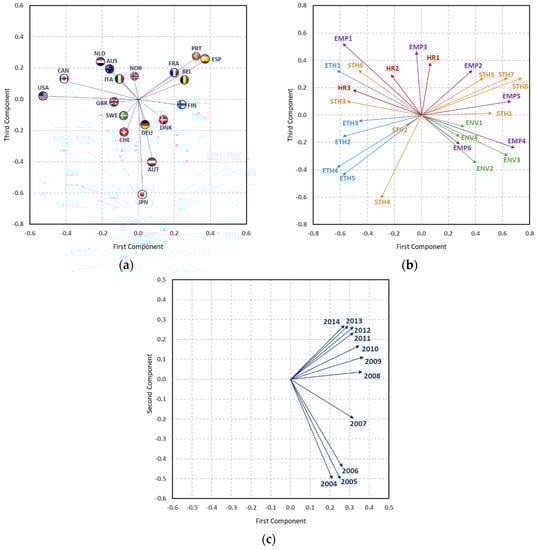 Graphics for the interpretation of the G331 element of core matrix, Tucker3 analysis. (a) countries; (b) CSR practices; (c) years.