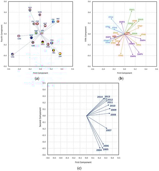 Graphics for the interpretation of the G451 element of core matrix, Tucker3 analysis. (a) countries; (b) CSR practices; (c) years.