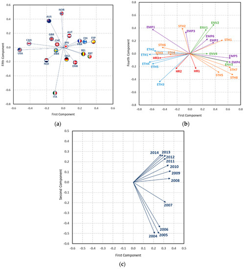 Graphics for the interpretation of the G541 element of core matrix, Tucker3 analysis. (a) countries; (b) CSR practices; (c) years.