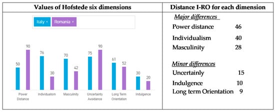 To understand the cultural context of both countries, we employed Hofstede’s six dimensions (power distance, individualism, masculinity, uncertainty avoidance, long-term orientation and indulgence). The results obtained for Italy and Romania and the distance between the countries are in the following graph (Figure 1).