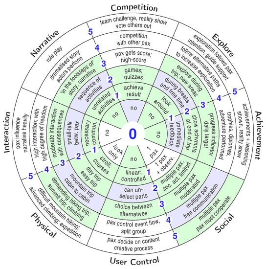To be suitable for guided trekking tours, we have modified the criteria for grading the eight dimensions by replacing exhibit-specific properties with characteristics that fit typical trekking tours in a broad sense. The detailed description for all 48 entries can be found in Table 1. Further, Figure 1 shows the related graphical chart where the entries are presented in its short form. Some remarks about the single dimensions are in order.