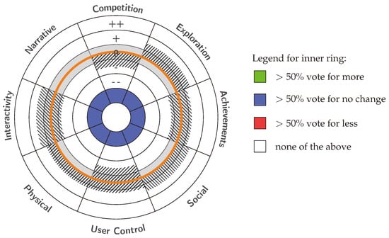 The analysis indicated that the participants of the poll generally did not want to alter the setup of trekking tours. The category for exploration showed the most positive value with a mean value of 0.13, while interaction, physical activity and social were at 0.08, each. However, the categories competition, user control and achievements were on the negative side with mean values of −0.50, −0.13 and −0.04, respectively. We interpreted this that the participants neither embrace competition nor user control.