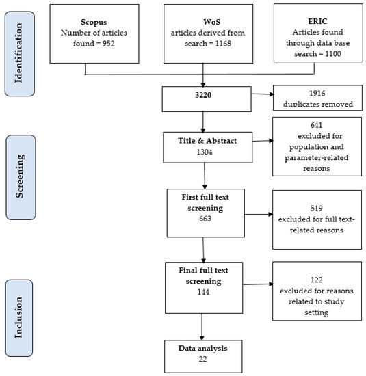 The ERIC database search yielded 1100 relevant articles. It is noteworthy to mention that the “OR” and “AND” operators generally combine clusters/key terms during the search. WoS database search followed using similar key terms, with the search returning a total of 1168 articles. Only advanced search was possible within the Scopus database, and similar search terms were used as for the other databases; 952 relevant articles were derived from this search. All 3220 articles gathered from the databases were compared, and the duplicates (1916 articles) were removed, leaving 1304 articles for further screening and analysis. Figure 3 shows a flowchart of article screening procedure.