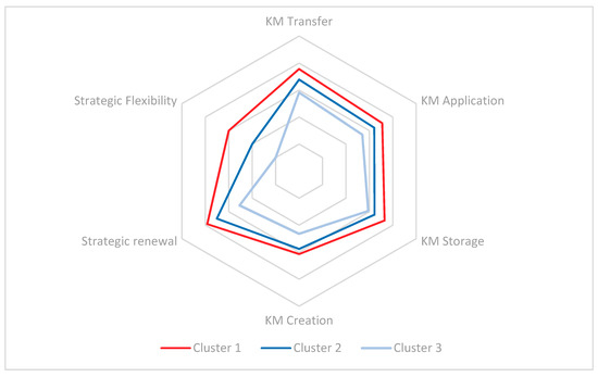 Two-step clustering results revealed that the dataset can be split into three clusters (see Table 3 and Figure 1). From the overview summarized in Table 3 and Figure 1, it is worth noting that a correspondence exists between the level of KM practices, the level of strategic flexibility, and the level of strategic renewal behavior of family businesses. More specifically, when higher values of strategic flexibility and KM practices are observed, it is expected that the firm has higher strategic renewal results.