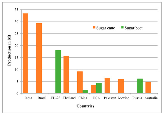 The ten main producers and their relative amount offered on the market in 2018 are shown in Figure 2. India is the most important country, with more than 33 Mt of sucrose produced by sugarcane, followed by the EU-28, with about 18 Mt from sugar beet.