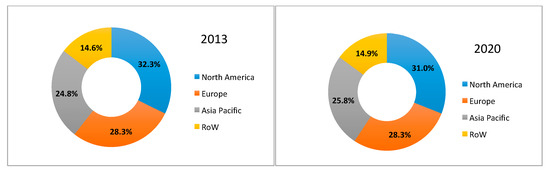 The packaging market for transport in bulk is increasing and includes various segments: bulk container liners, flexi-tanks (for liquid), and flexible intermediate bulk containers (FIBC). The most recent data stated that, in 2013, FIBC was the largest product segment of the overall market. Bulk container liners held a 35% share and are expected to display moderate growth until the end of 2020 (TMR—Transparency Market Research 2016). As shown in Figure 4, in 2020 North America (mainly the United States) and Europe will continue to dominate the packaging market for transport in bulk, with 31.0% and 28.5%, respectively. Indeed, there are several multinational cooperation and European industries, which operate in the European community market (Bulk Flow 2017; Europages 2017). Asia (mainly China) will be the fastest growing region, with 25.8% in 2020.
