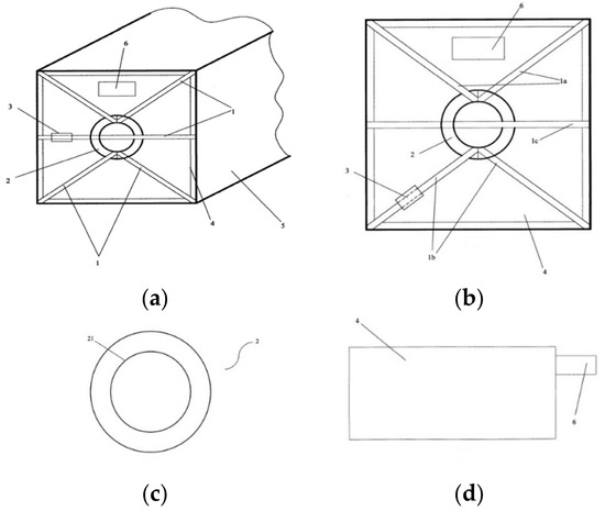 In the front view (Figure 5b), it is possible to notice the system of belts anchored on the inner wall of the container. Each of them must also be fixed to the center ring, to act as support of the same; in addition, they are arranged horizontally and diagonally, with anchorages in the opposite position. There is a possibility that each belt can move around the ring several times, mostly for assuring the anchorage. The whole structure is tensioned by means of special ratchet levers (3), which can act on each belt. It is preferable to act on the belt located at the bottom of the liner (4). Unlike known systems, this type of structure can be tensioned by a single cargo point to balance the entire structure uniformly, thanks to the inner structure of the ring.