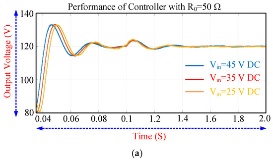 Figure 11 presents the performance of the controller to present the fixed voltage at the load side by changing the input voltage values. As known, PV panels based on different irradiance and temperatures present different values of voltages. Therefore, one of the specifications of a good converter and controller is the ability in obtaining a fixed DC voltage for load by different values of the input voltage. Therefore, in the worst condition, if both the input voltage and output load change, we should consider the performance of the controller for reliability analysis. Figure 11 presents the reaction of the controller for input voltages from 25 V to 45 V and load values from 50 Ω to 200 Ω. As reported in Figure 11a, and as expected, for higher loads where higher currents are needed, the overshoot is higher and the settling time is longer. For a higher amount of input voltages and lower amount of output currents, as Figure 11c presents, both overshoot value and settling time are less. In addition, it can be found that when the input voltage is higher for a fixed load, the overshoot is less and settling time is shorter.