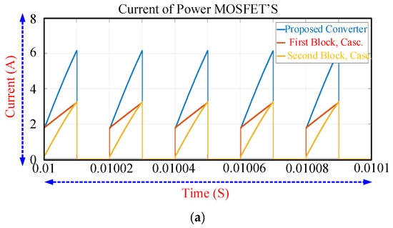 Figure 12 illustrates the current values for the power MOSFETs, output diodes, and input inductors of around 50 W of output power. As can be seen from Figure 12a,b, approximately the average value of the current for the switch in the proposed converter was equal with the total currents of switches in the cascaded converter. In fact, we should make a trade-off between having two different power MOSFETs with two controller structures and only one power MOSFET with only one controller. Moreover, for the new SiC generation of power MOSFETs, we can present a quick and stable converter and resonant snubber structures can be used to decrease these stresses. Figure 12c,d show that the proposed converter can present a lower amount of currents for the input inductor and output diode. However, this difference was not impressive. In general, as the mathematical analysis shows, the total losses of the proposed converter are comparable with the cascaded converter and for higher amount of power, it is more efficient.