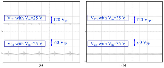 In Figure 16a, under 25 V as the input voltage, by applying the proposed controller method, the output voltage was set to 120 V. So, as expected based on Equation (30), half of this value was measured on the first capacitor and the second half of the proposed converter doubled this value on capacitor C0. This test was undertaken on a 120 Ω resistive load, so the voltages on the capacitors, especially the voltage on capacitor C1, had fluctuations on switching times. The load value was set to 240 Ω and the input voltage was increased to 35 V for Figure 16b, and as shown, these sudden ripples decreased. This event is normal because not only was the input voltage increased, but the output current was also a lower level in comparison with the first test. Figure 16c presents the current waveforms of the inductors for a 150 Ω resistive load with 120 V and 25 V as the output and input voltages, respectively. As the results show, the current of the inductor LY was less and the result confirmed Equations (34) and (35). Additionally, ripple values were reported of around 1.3 and 1.8 A for LX and LY, respectively, which is in agreement with the mathematical analysis presented in Table 1. Figure 16d reports the results of the same process with a 250 Ω resistive load, 35 V input, and 120 V output voltages. The obtained currents and ripple values confirmed the same equations mentioned for Figure 16c.