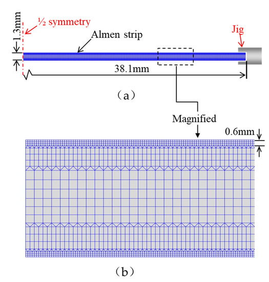 (a) Boundary condition of the Almen strip when a modified Almen strip holder is used; (b) Enlarged meshes at a part.
