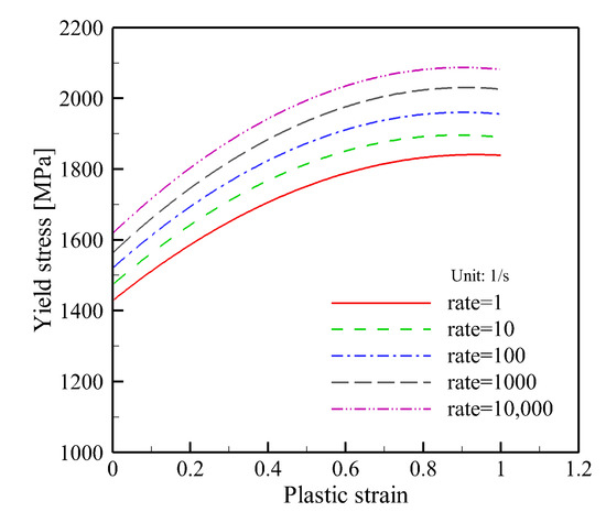 The material parameters of the Johnson-Cook model used in this study were taken from the literature [16]. Figure 3 shows the strain rate dependent flow stress behavior of the Almen strip used in FE simulation.